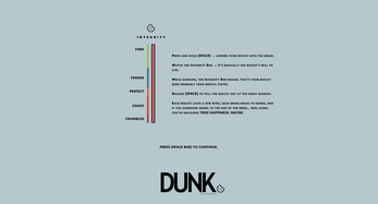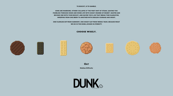 Dunk is a satirical biscuit-dunking game where the fate of your week hangs by a crumb. Each biscuit, cup and drink has its quirks so you’ll juggle risk and reward as you choose how far to push your luck in search of that perfect dip.